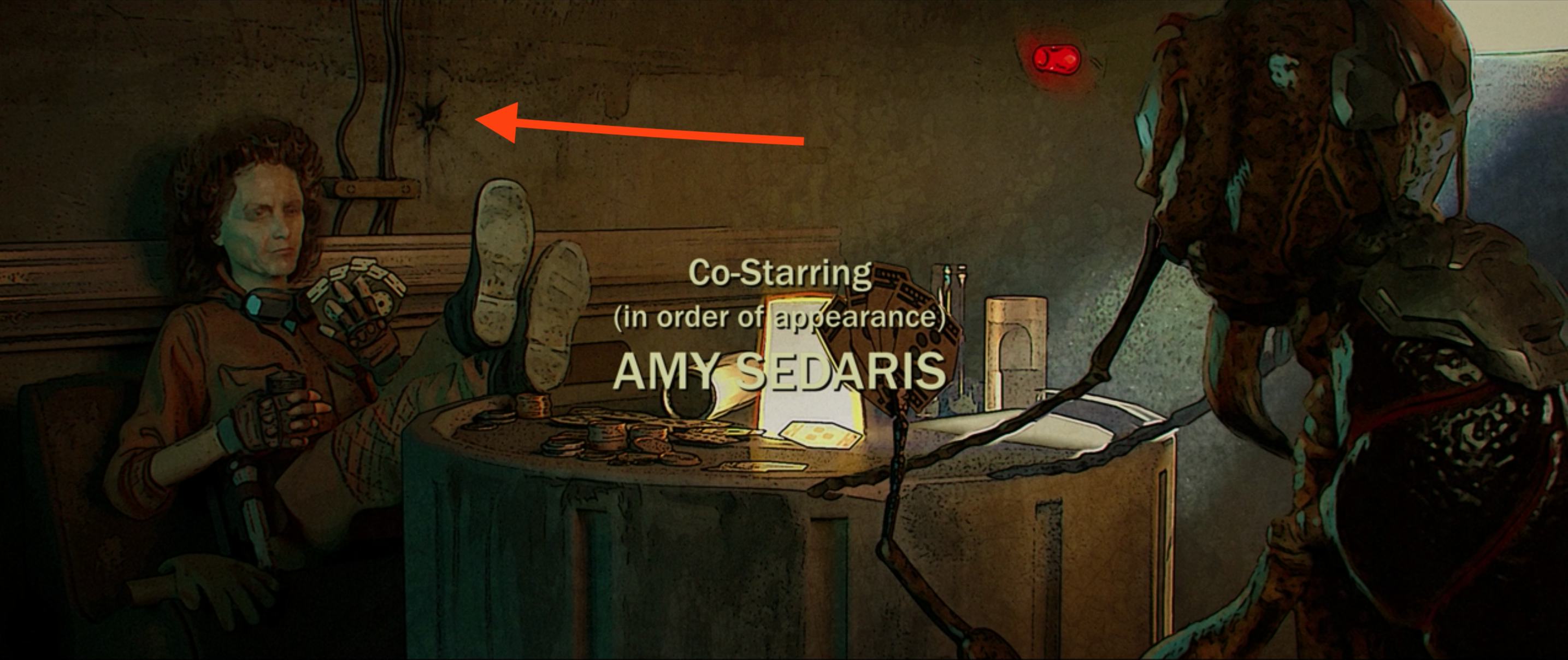 In the end credits of the second episode of season two, we see concept art of one of the more popular characters in the show, Peli Motto. She's leaning back with her feet on the table, playing cards with Dr. Mandible. If you examine her surroundings a little more thoroughly, you may notice that they are sitting in what appears to be the booth Han Solo and Greedo were at during the infamous moment. The most important piece for the argument is the blaster mark on the wall to the right of Motto. If it is the same booth, then that scorch mark could only be from one thing: Greedo's shot.